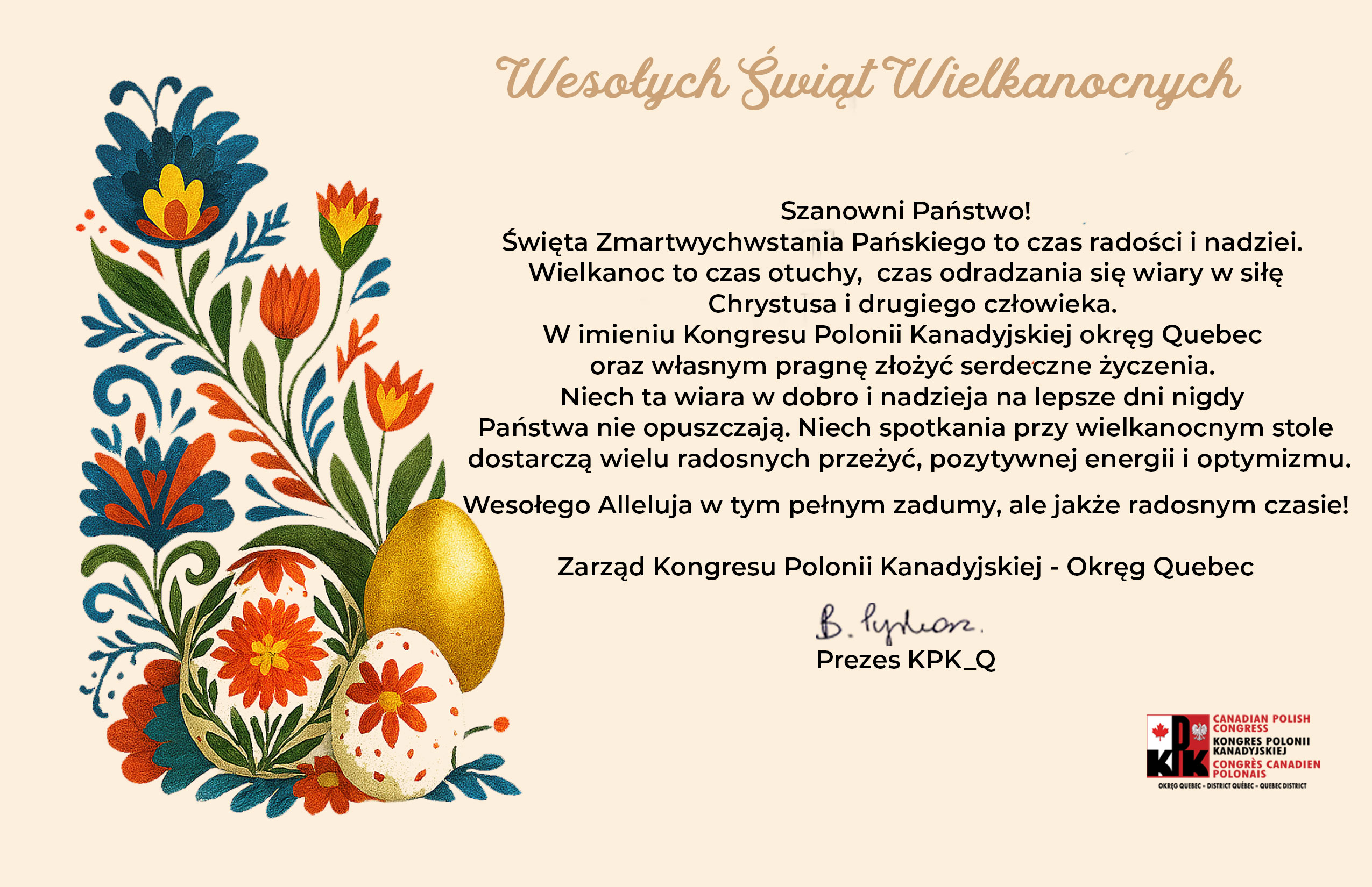 The Canadian Polish Congress (Kongres Polonii Kanadyjskiej, KPK) is an umbrella organization founded in 1944 and established to coordinate the activities and to articulate the concerns of approximately one milion Canadians of Polish heritage. One of its aims is to promote Polish culture, language, tradition and knowledge of Polish contribution within Canada not only to people who have immigrated from Poland but to all Canadians in order to foster a better understanding and spirit of multiculturalism.